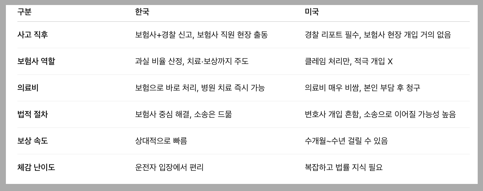 한국 vs 미국 자동차 사고 처리 비교